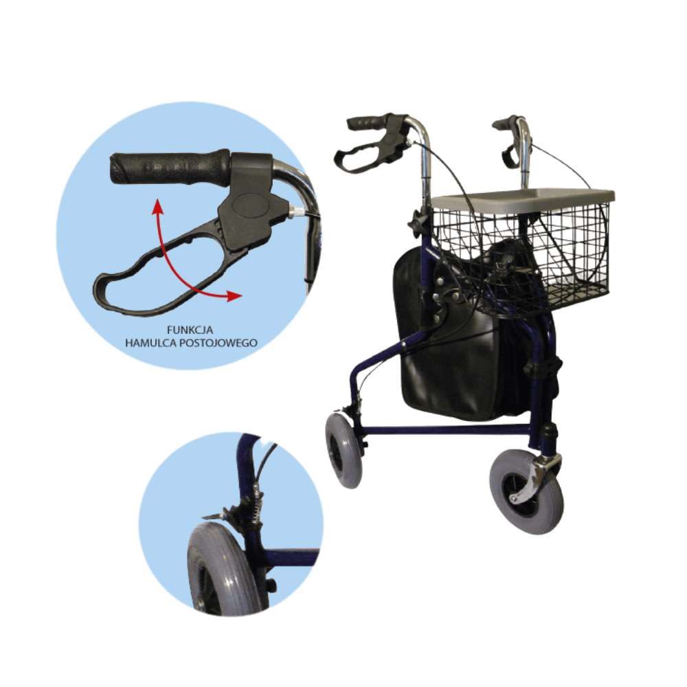 Balkonik trójkołowy z torbą i koszykiem to wielofunkcyjny sprzęt pomocniczo-rehabilitacyjny, dedykowany osobom z trudnościami w poruszaniu się, utrzymywaniu równowagi lub pionizacji. Wyposażony w stalową, składaną ramę oraz zestaw praktycznych dodatków, sprawdza się zarówno w rehabilitacji, jak i podczas codziennych aktywności, spacerów czy zakupów. Regulacja wysokości, ergonomiczne uchwyty oraz system hamulców postojowych zwiększają bezpieczeństwo użytkownika. Połączenie torby i koszyka daje możliwość swobodnego przewożenia rzeczy osobistych i zakupów. Konstrukcja malowana proszkowo zapewnia trwałość i odporność na intensywne użytkowanie oraz czynniki zewnętrzne.