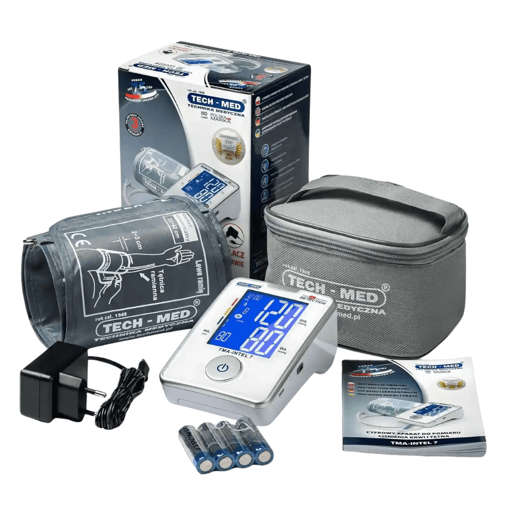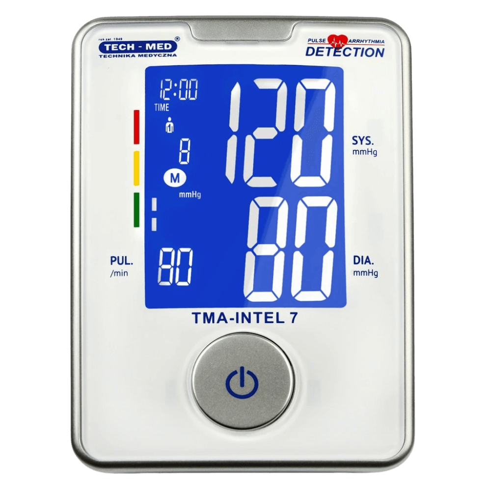 TECH-MED TMA-INTEL 7 to nowoczesny, w pełni automatyczny ciśnieniomierz naramienny, który zapewnia najwyższą dokładność, wiarygodność oraz komfort pomiaru w warunkach domowych. Zaawansowany algorytm pomiarowy gwarantuje rzetelne wyniki nawet przy występowaniu arytmii, a bardzo duży, czytelny wyświetlacz LCD z wysokim kontrastem i dużymi cyframi sprawia, że urządzenie jest idealne dla seniorów oraz osób z osłabionym wzrokiem.