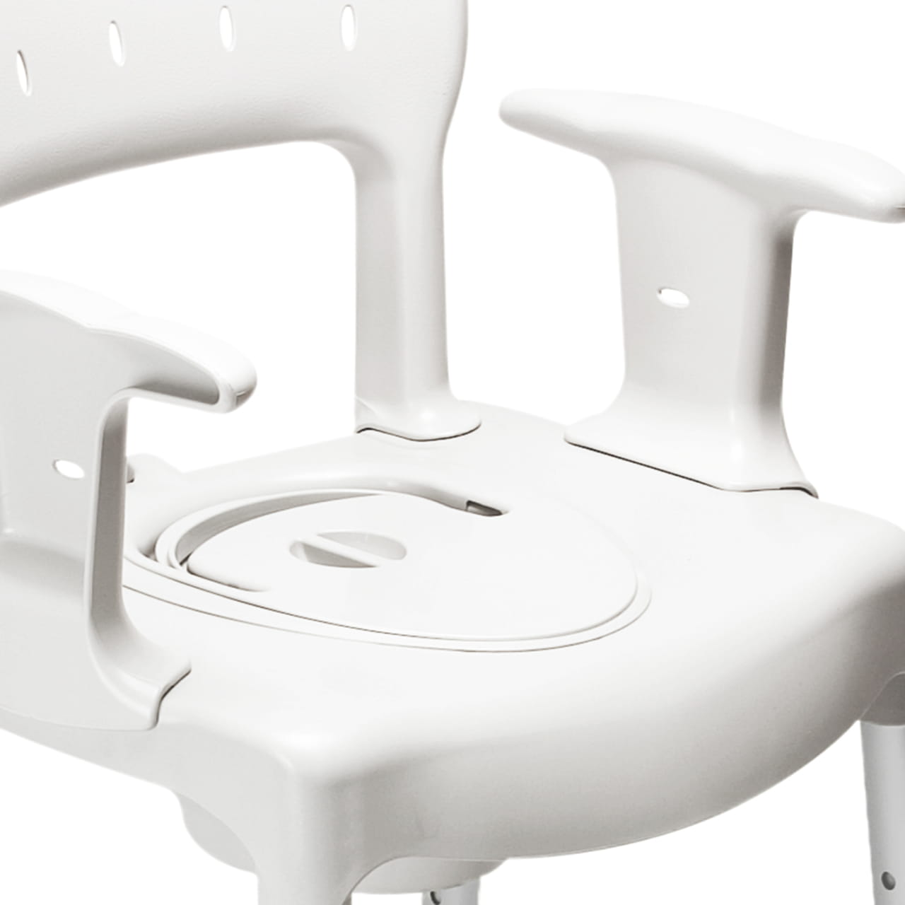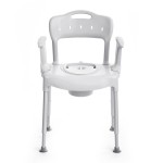 Model Swift Commode został wykonany z trwałego, wodoodpornego tworzywa sztucznego, które jest jednocześnie lekkie i wytrzymałe. Dzięki temu krzesełko łatwo przestawić między pomieszczeniami, a jego neutralna biało-szara kolorystyka dobrze wpisuje się w domowe otoczenie – nie przypomina sprzętu szpitalnego. Oparcie i podłokietniki można zdjąć bez użycia narzędzi, co pozwala szybko dostosować krzesełko toaletowe do zmieniających się potrzeb użytkownika.