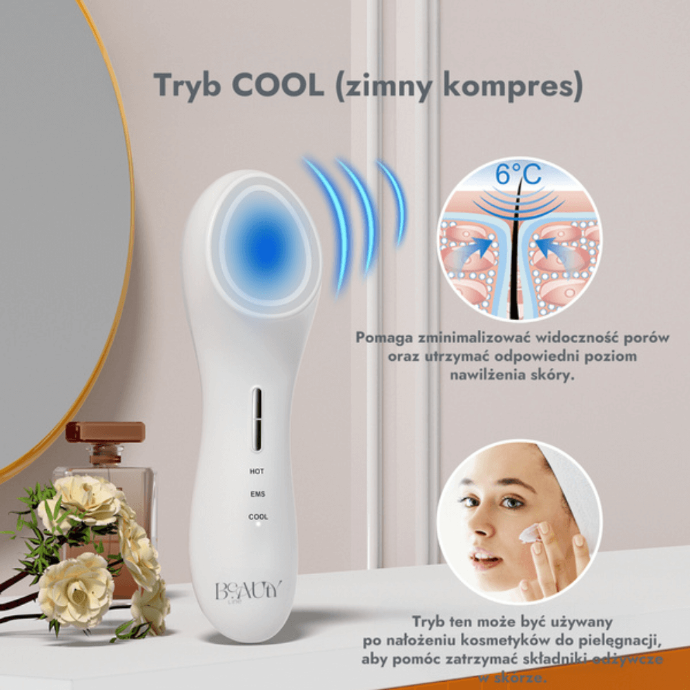 3 tryby działania: HOT, EMS i COOL – ciepło rozluźnia i poprawia wchłanianie kosmetyków, EMS wspiera ujędrnienie mięśni twarzy, a chłodzenie zmniejsza opuchliznę i widoczność porów.