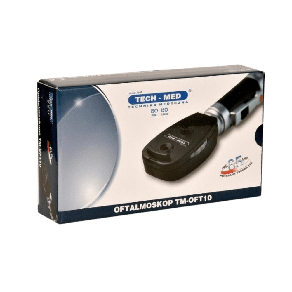Oftalmoskop TECH-MED TM-OFT100 to klasyczne, precyzyjne urządzenie medyczne używane w okulistyce oraz laryngologii. Udoskonalona technologia światłowodowa wraz z profesjonalnym systemem soczewek zapewniają jasne, równomierne oświetlenie i wyraźny obraz struktur oka, co umożliwia szybką i dokładną ocenę dna oka, tarczy nerwu wzrokowego, siatkówki oraz odruchu źrenicznego.