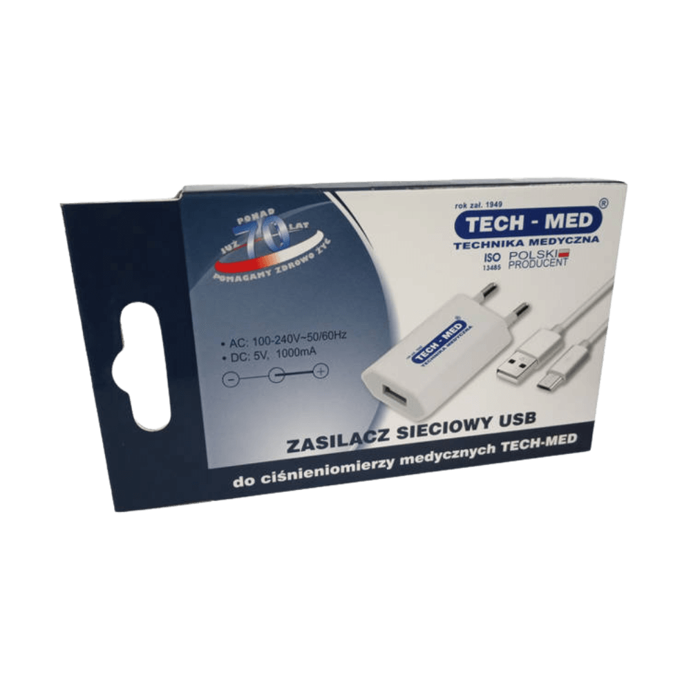 Oryginalny zasilacz sieciowy USB TECH-MED to dedykowane akcesorium do wybranych modeli ciśnieniomierzy TECH-MED, które zapewnia stabilne i bezpieczne zasilanie urządzenia.