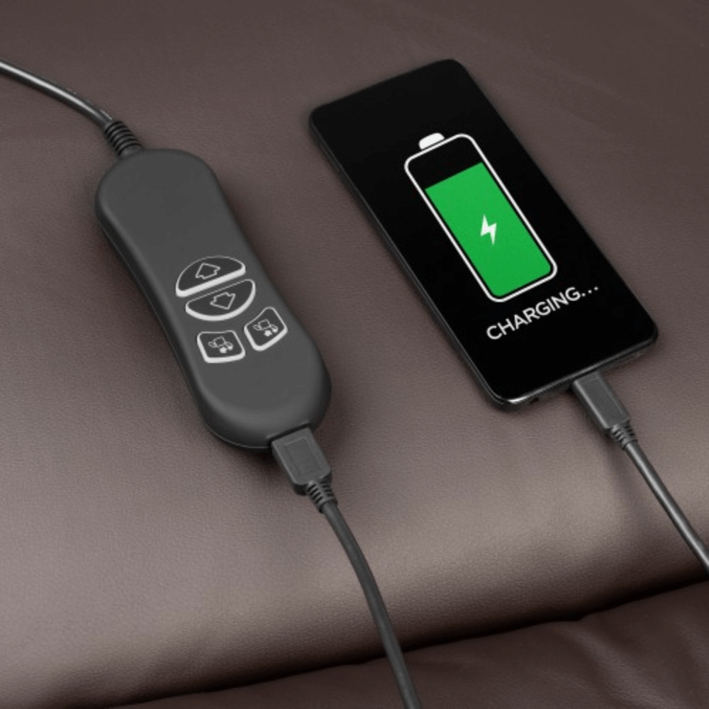 Pilot sterujący z portem USB - pozwala na łatwe sterowanie funkcjami fotela oraz ładowanie innych urządzeń.