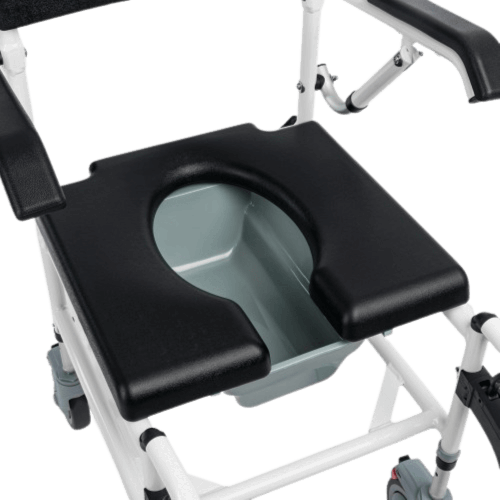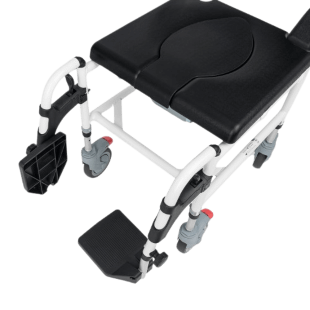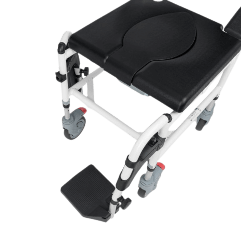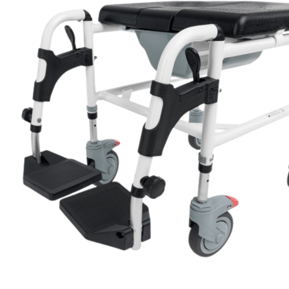 Funkcja 3w1 - wózek pełni funkcję prysznicową, transportową i toaletową, co czyni go wszechstronnym wsparciem w codziennej opiece.