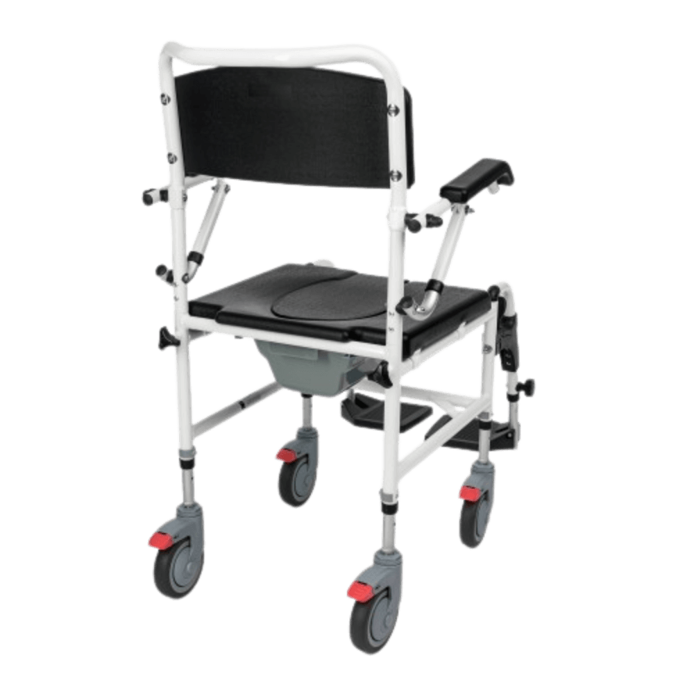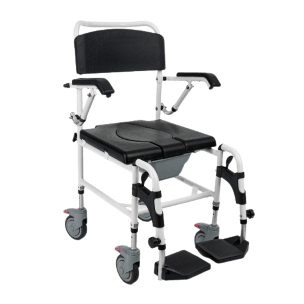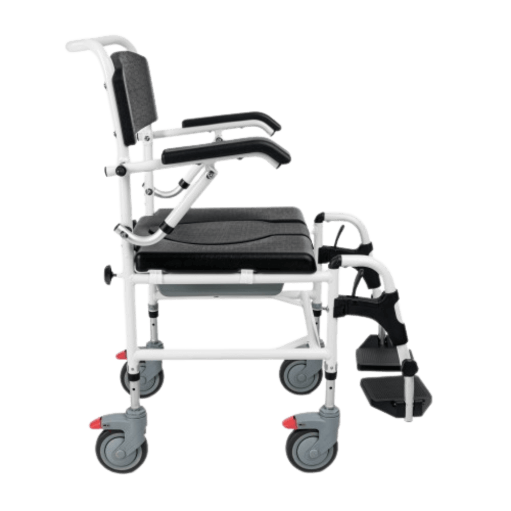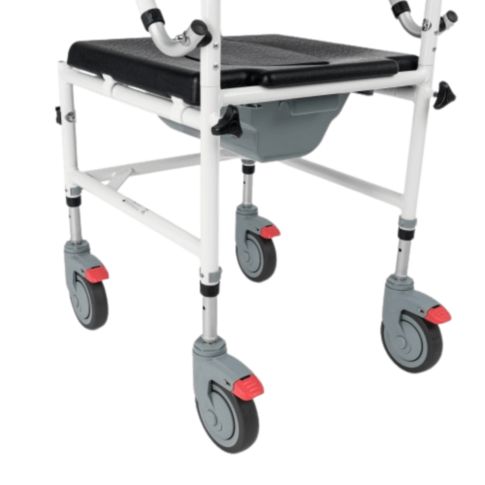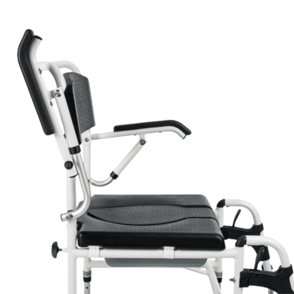 Funkcja 3w1 - wózek pełni funkcję prysznicową, transportową i toaletową, co czyni go wszechstronnym wsparciem w codziennej opiece.