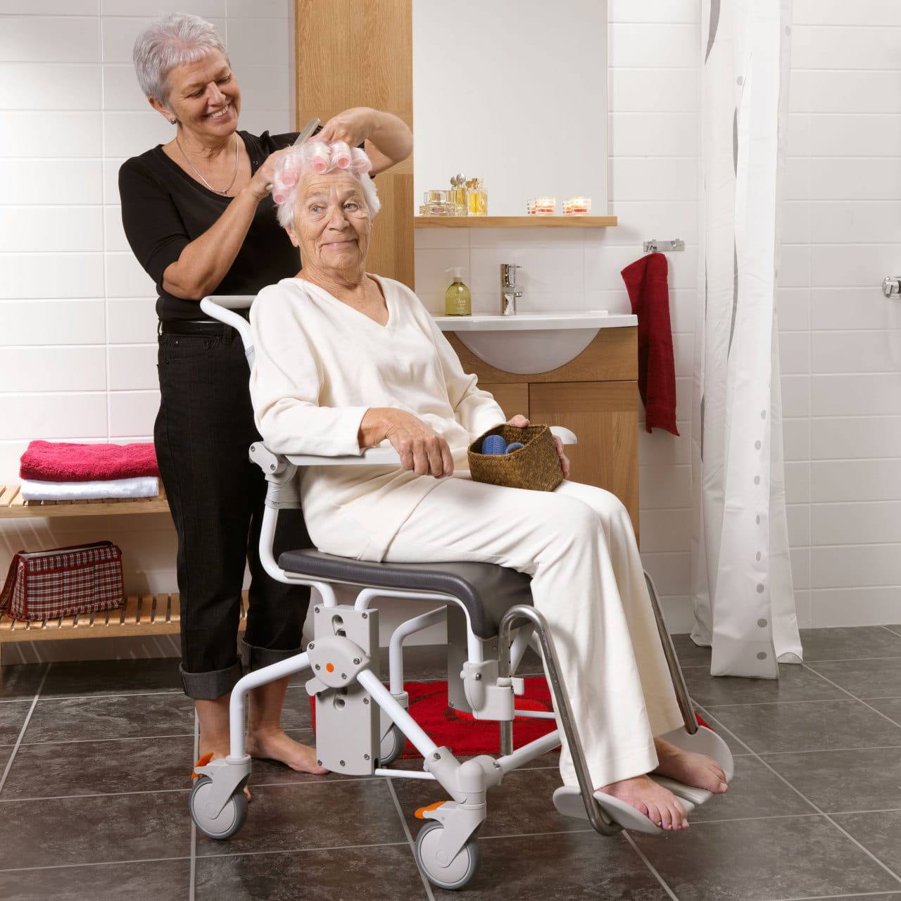 - Wózek prysznicowy – wykonany z materiałów nierdzewnych, odpornych na wilgoć i łatwych w czyszczeniu.